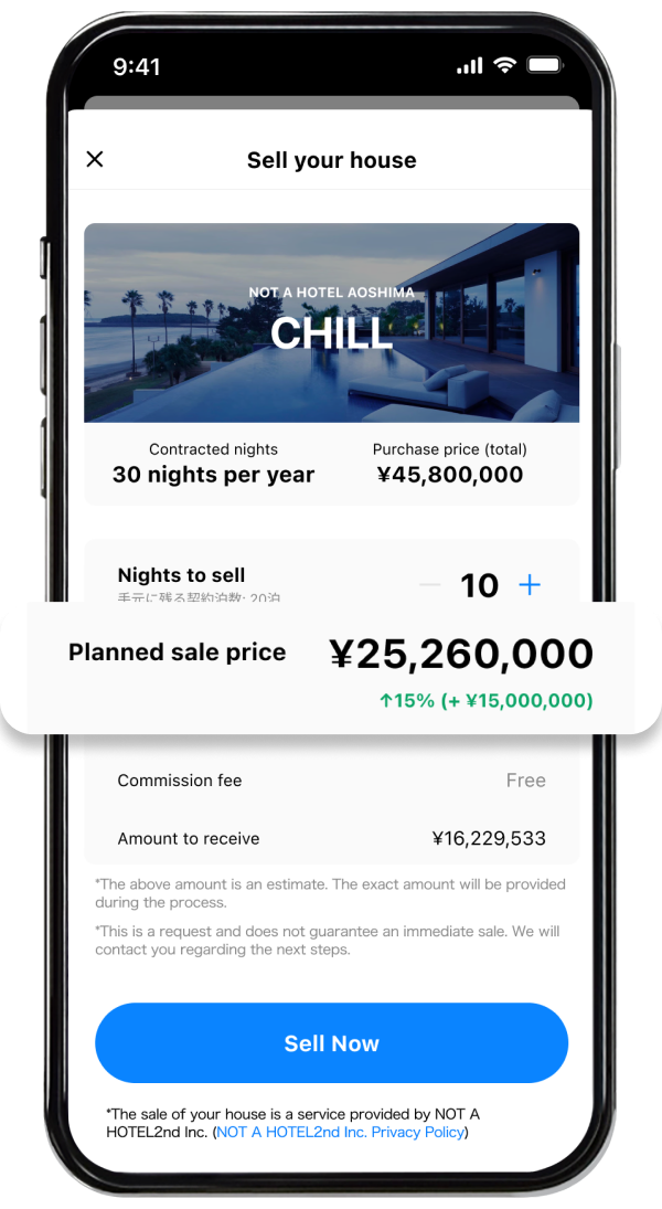With NOT A HOTEL 2ndâs immediate buyback, you can liquidate your ownership at any time. This allows you to release value instantly without incurring a significant loss.