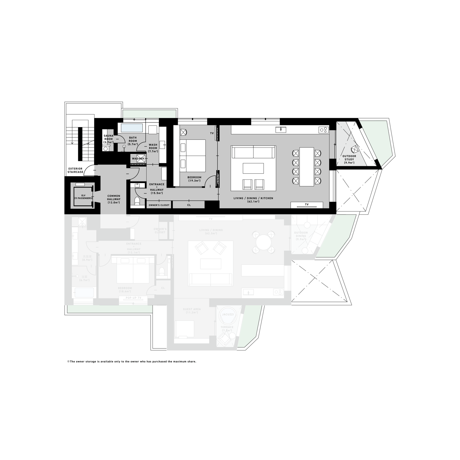 Interior size: 117.02㎡ (1,259.59 sq ft)Total area: 126.90㎡ (1,365.94 sq ft)