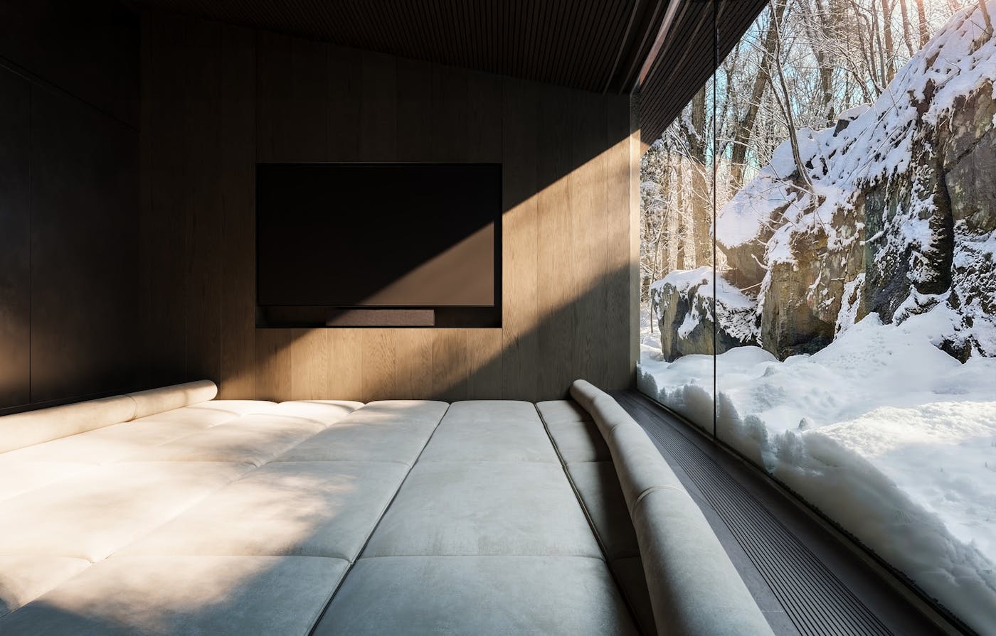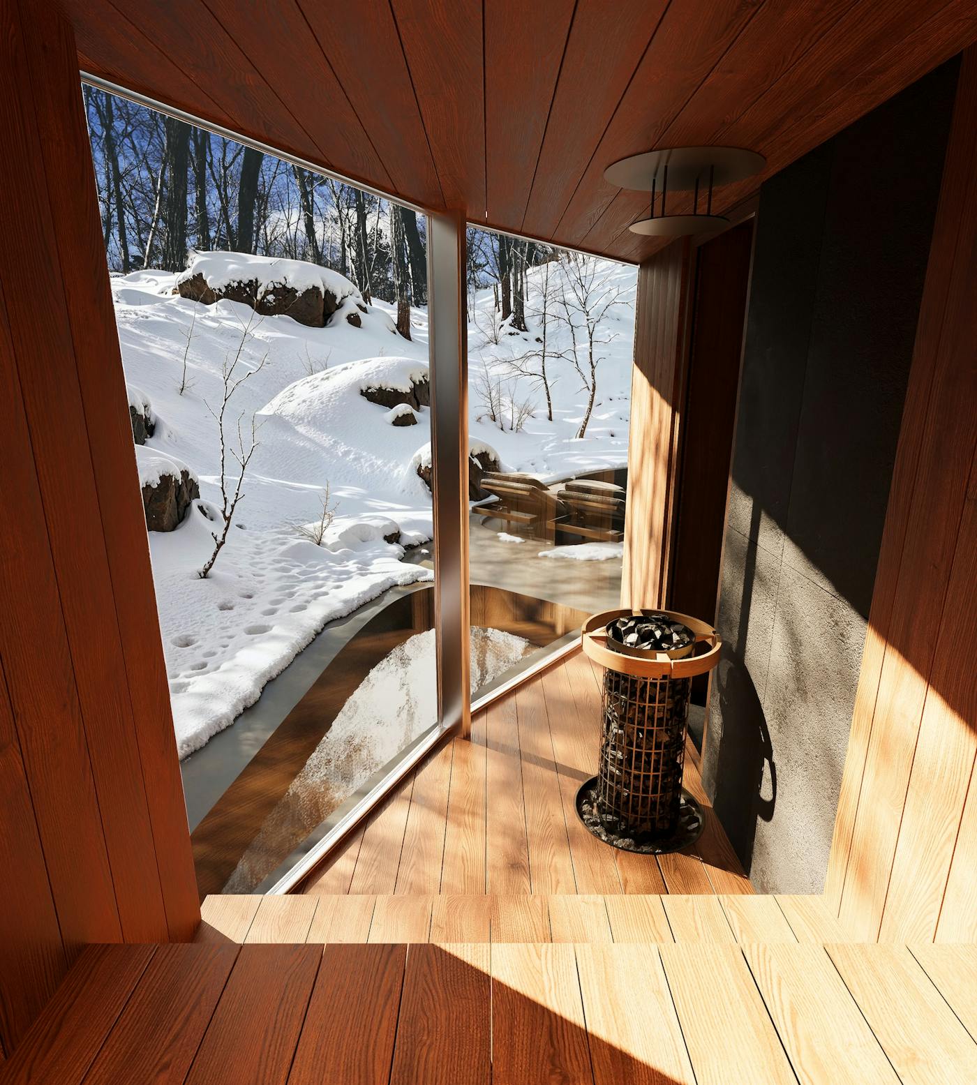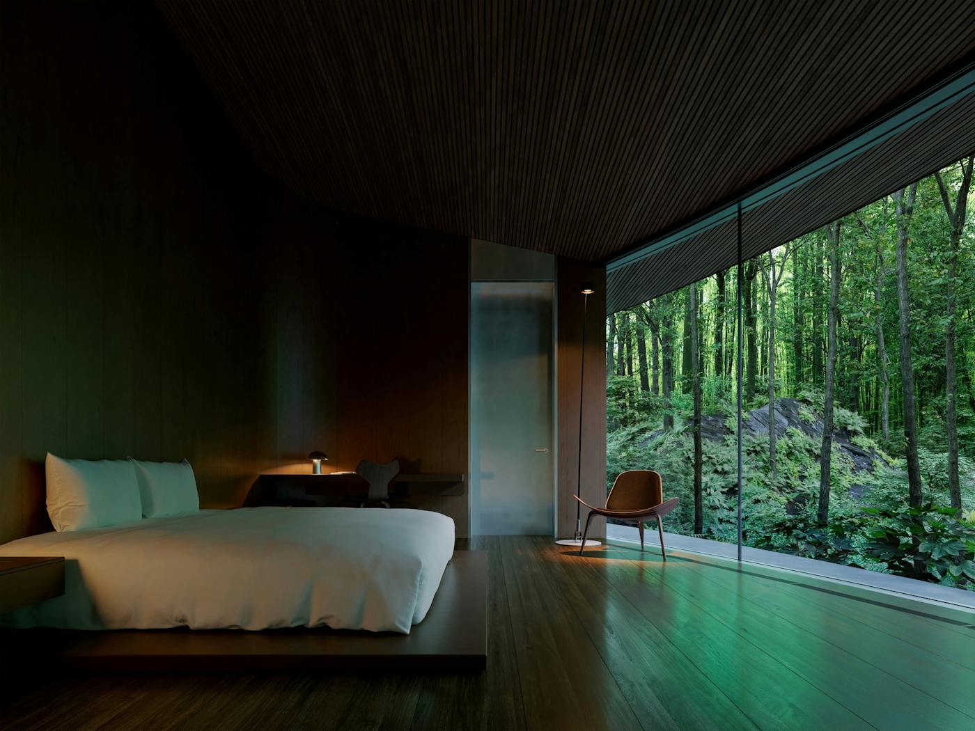 The guest bedroom is surrounded by rocks and trees, creating a sense of privacy. As a mix of wood, stone, and soft light, the space is a beautiful blend of natural textures. The silence of the forest flows right into it, creating a moment of peaceful rest.