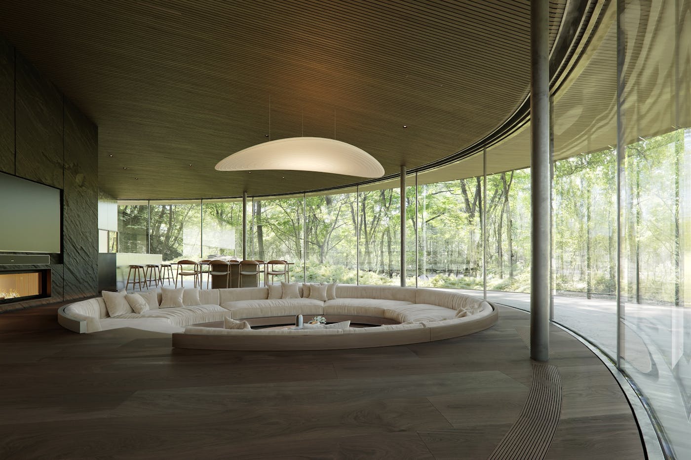 The 97m² living/dining room offers an open, panoramic view that makes guests feel as if they are in the middle of a forest. The original oval sofa and pendant lights, designed to complement the architectural form, take center stage in this space, creating a relaxing spot.
