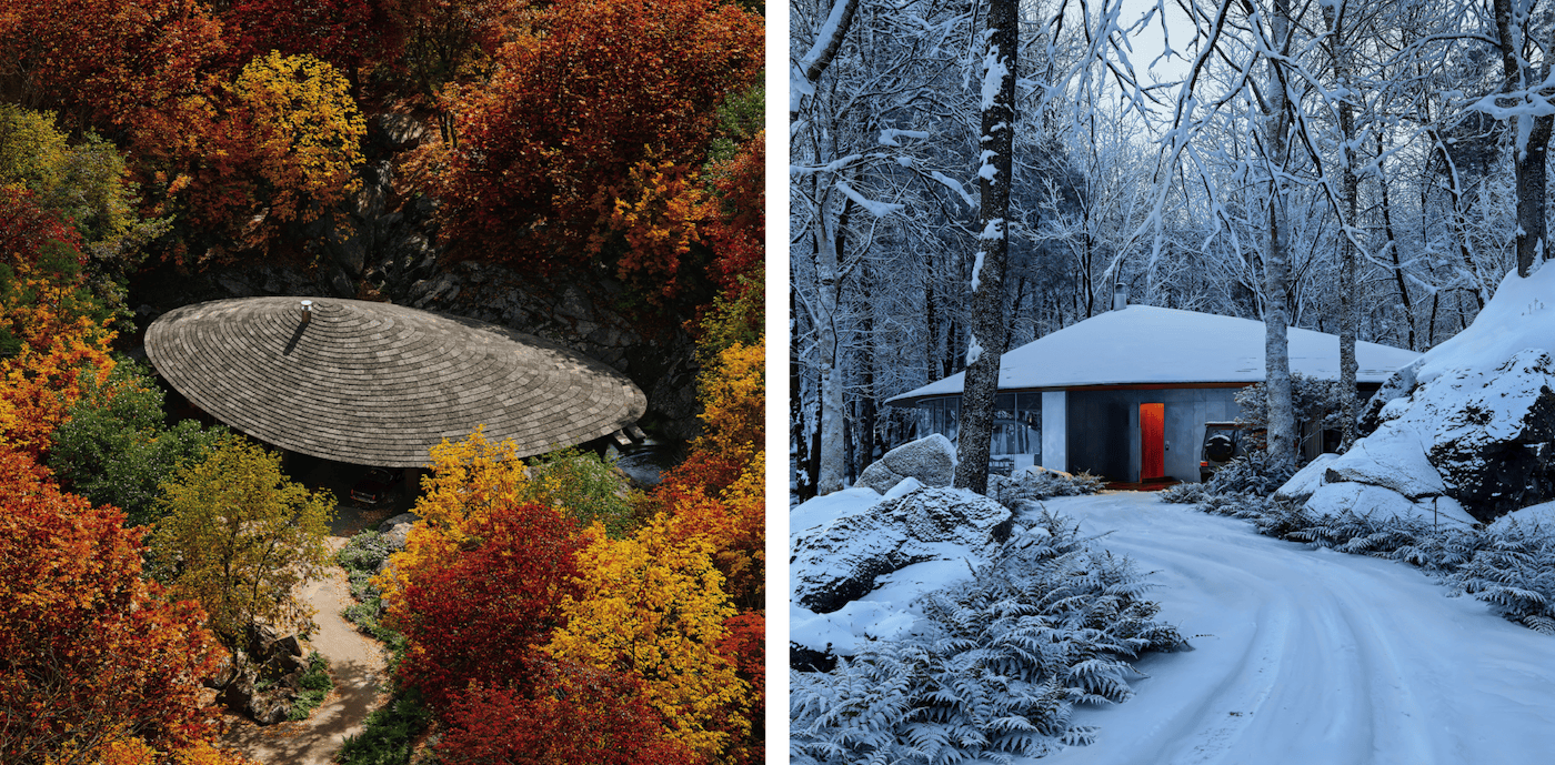 The site's ancient landscape combines scattered giant lava rocks, groves of trees, and the dramatically rising earth. Inspired by the natural environment, the architecture is soft yet bold in tracing the undulating ground. Nature is not just to be viewed, but lived within, weaving new stories among the rocks.
