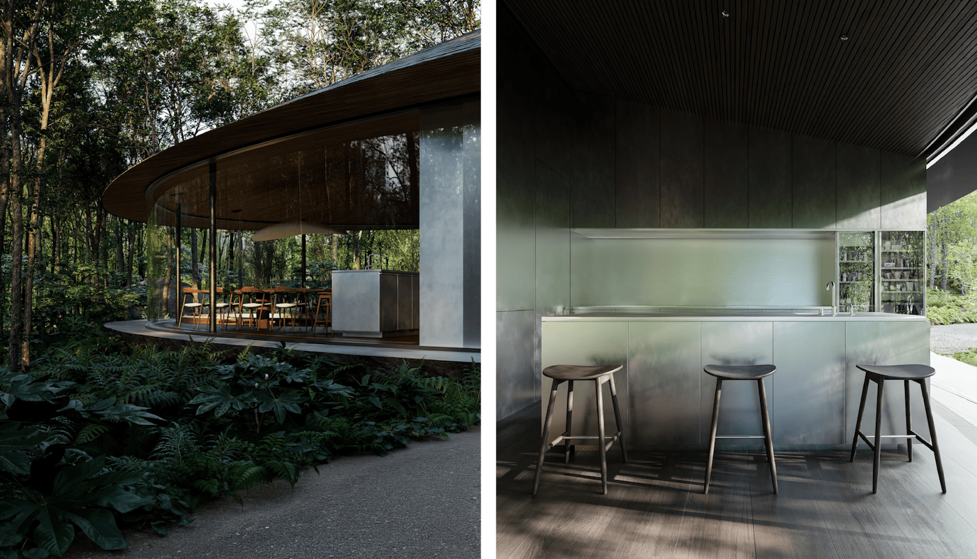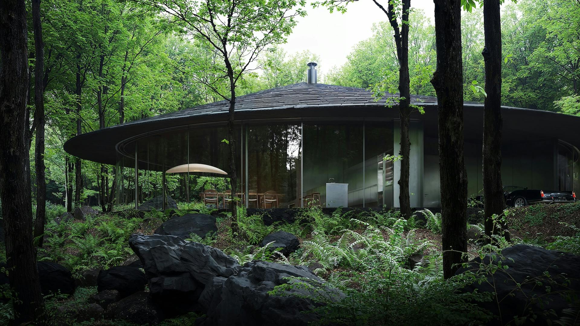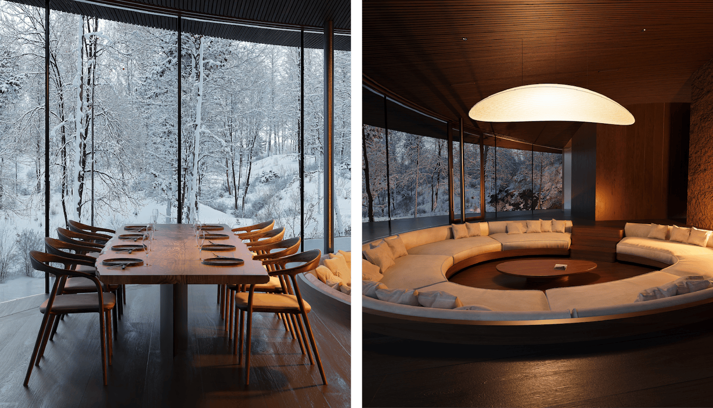 The shape of NATURE WITHIN is an imperfect oval, designed to blend into the terrain. The roof appears to float between three lava rocks, with a gently curved space that spreads out below. Defined by wood, rock, glass, and raw metal, the space dissolves into the surrounding majestic nature, quietly reflecting the beauty of its landscape, creating a stage for an extraordinary experience. This organic form allows the house to rise discreetly from the ground, with a facade composed primarily of glass that frames expansive views of the landscape and allows natural light inside. Owners and guests can enjoy a variety of scenes, such as an open view of the forest or directly into large rocks.