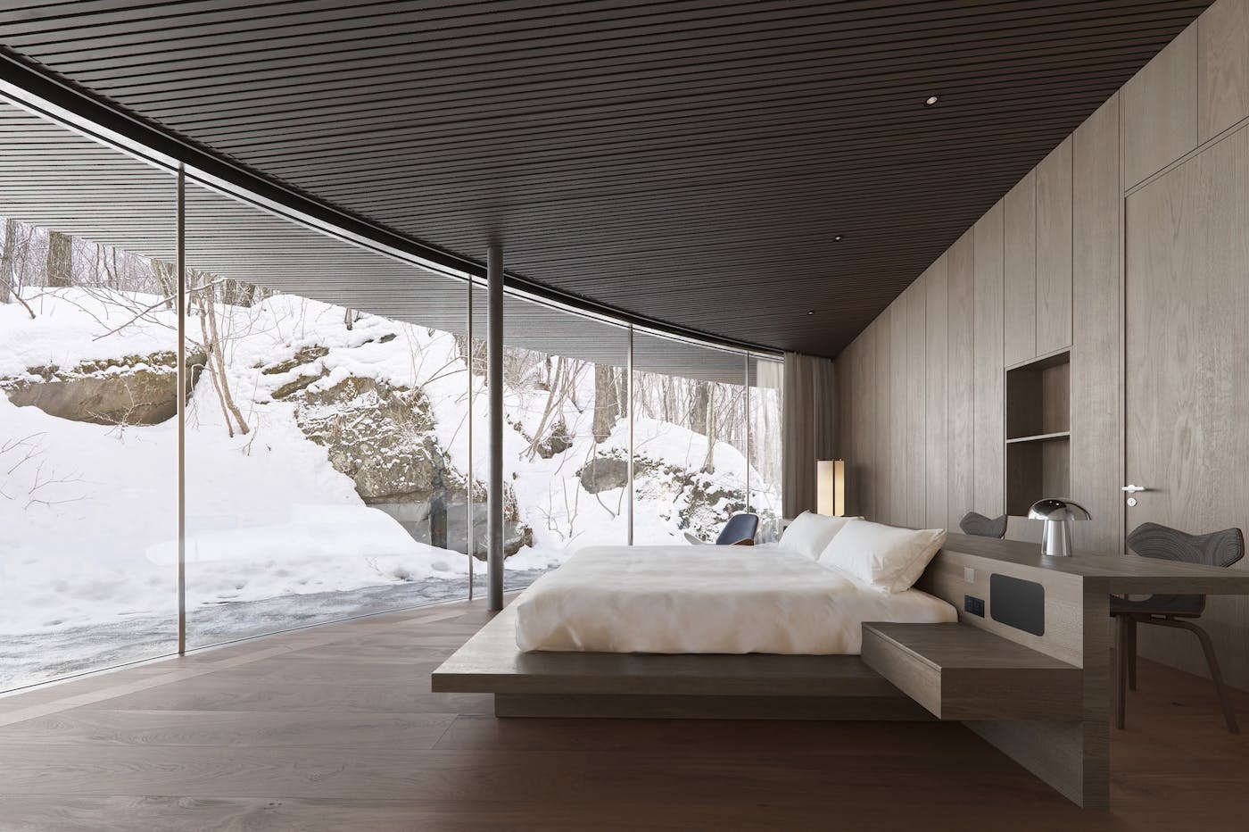 The bedroom uses a calming wood motif. The minimalist space accentuates the abundant natural scenery outside the window, evoking a sense of the boundary between inside and outside. The primary bedroom has direct access to the open-air bath on the terrace.