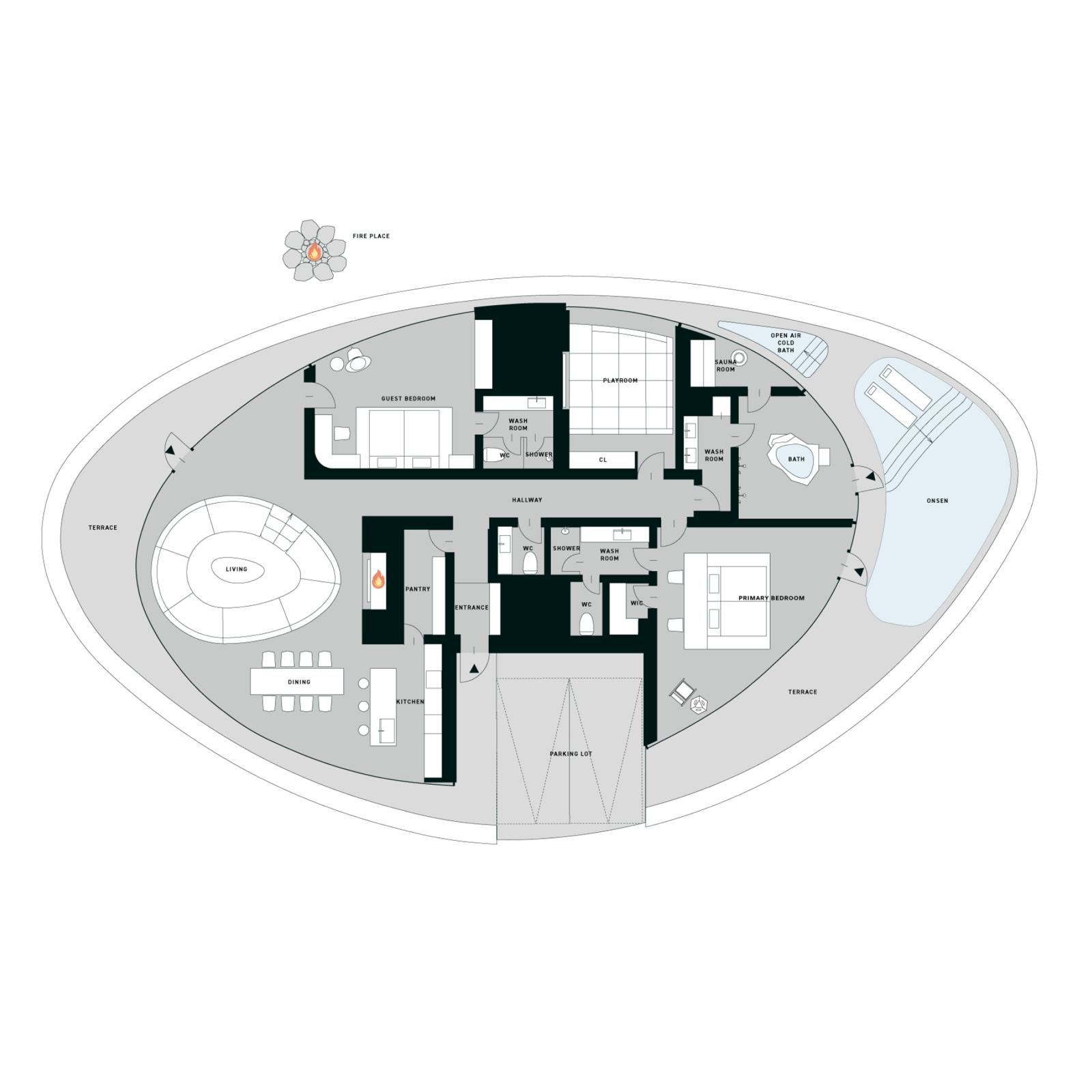 Open-air Bath & Rock Bath (Onsen)Outdoor fireplaceSaunaPlayroomFull, modern gallery kitchenDining table for 8 guestsTerrace