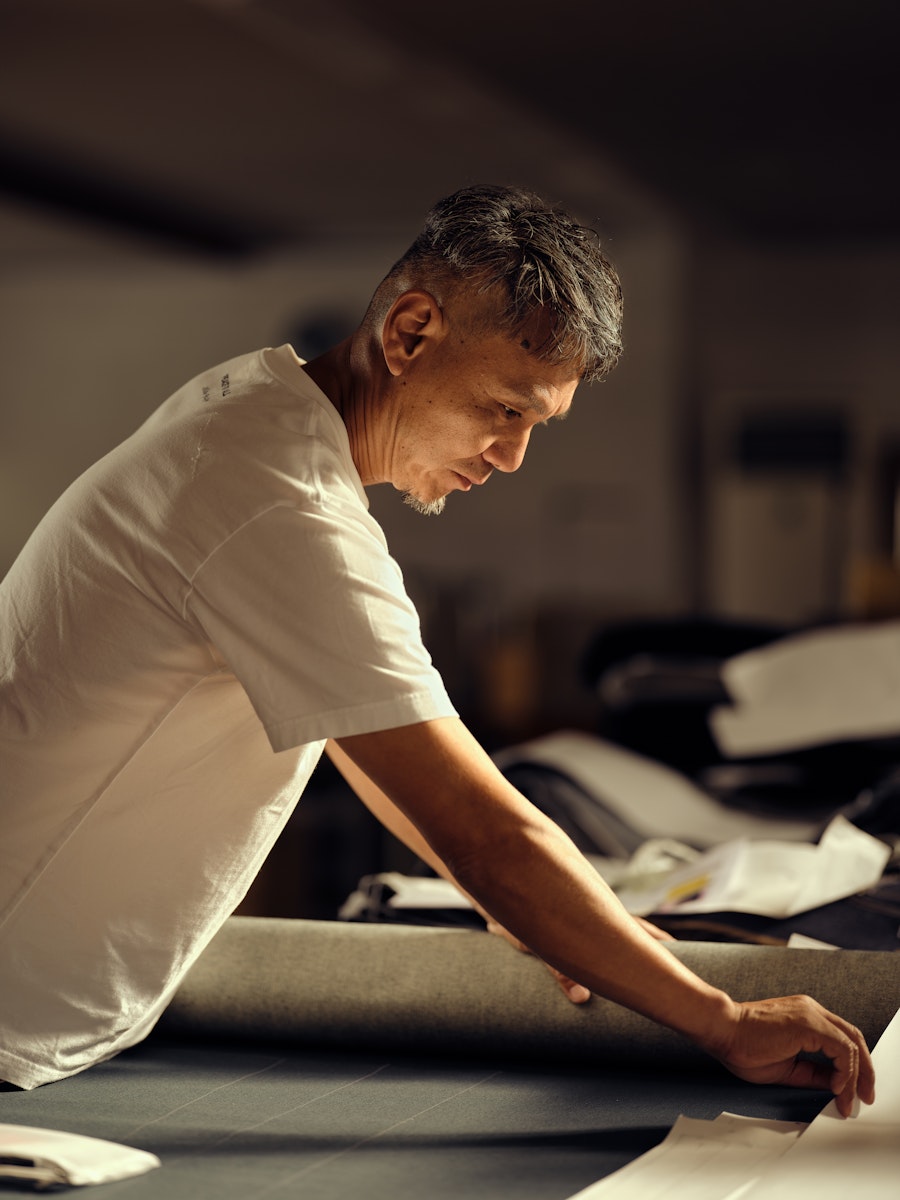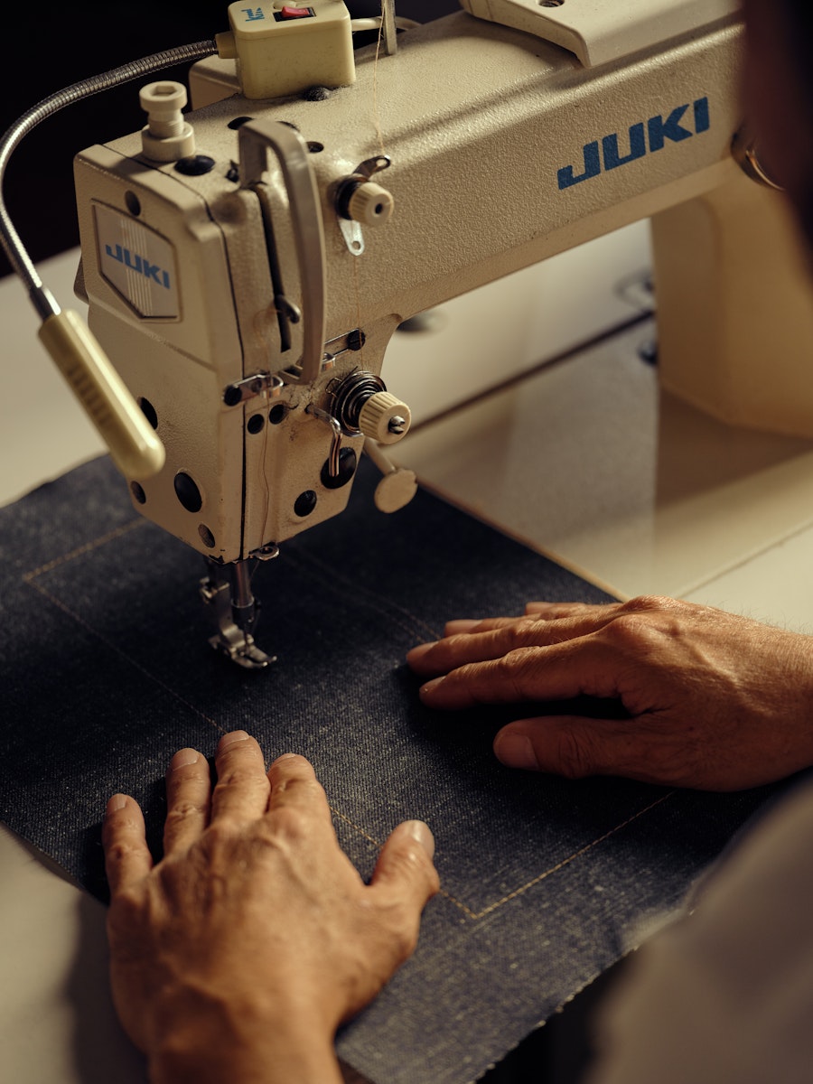 デニム職人の聖地・広島県福山市。工房で世界の名だたるブランドが信頼を寄せる職人たちの技術を間近に感じながら、一人ひとりのご希望に合わせた究極のオリジナルデニムを仕立てます。ジャケットやパンツなど、どんなデニムウェアでも対応可能。生地選びから、ボタンやステッチの色まで、ここでしか出会うことができない、真のフルオーダーデニムを叶えます。