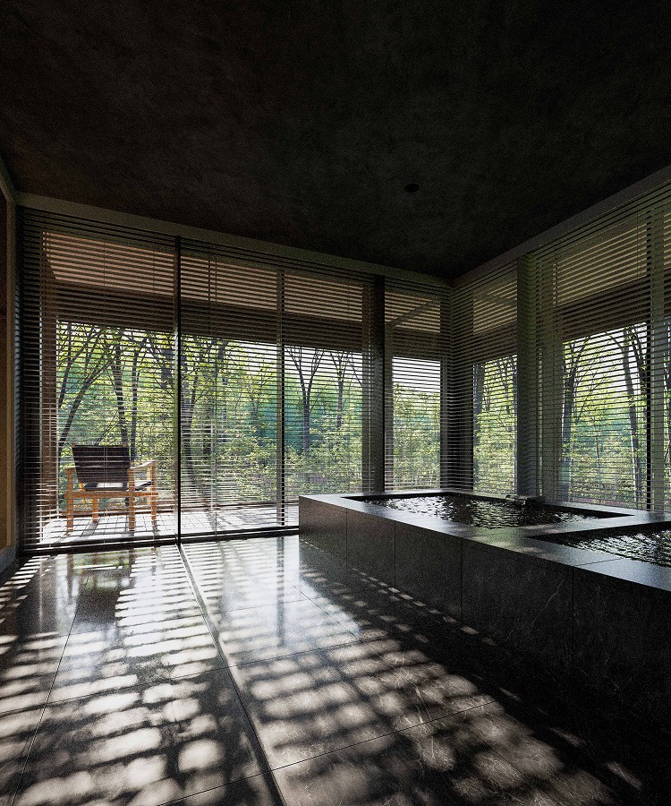 周囲の自然を望むように配置された浴槽には水風呂も備え、隣接するサウナとの行き来もスムーズに。都会の喧騒から離れ、心と身体を癒すための理想的な場所。