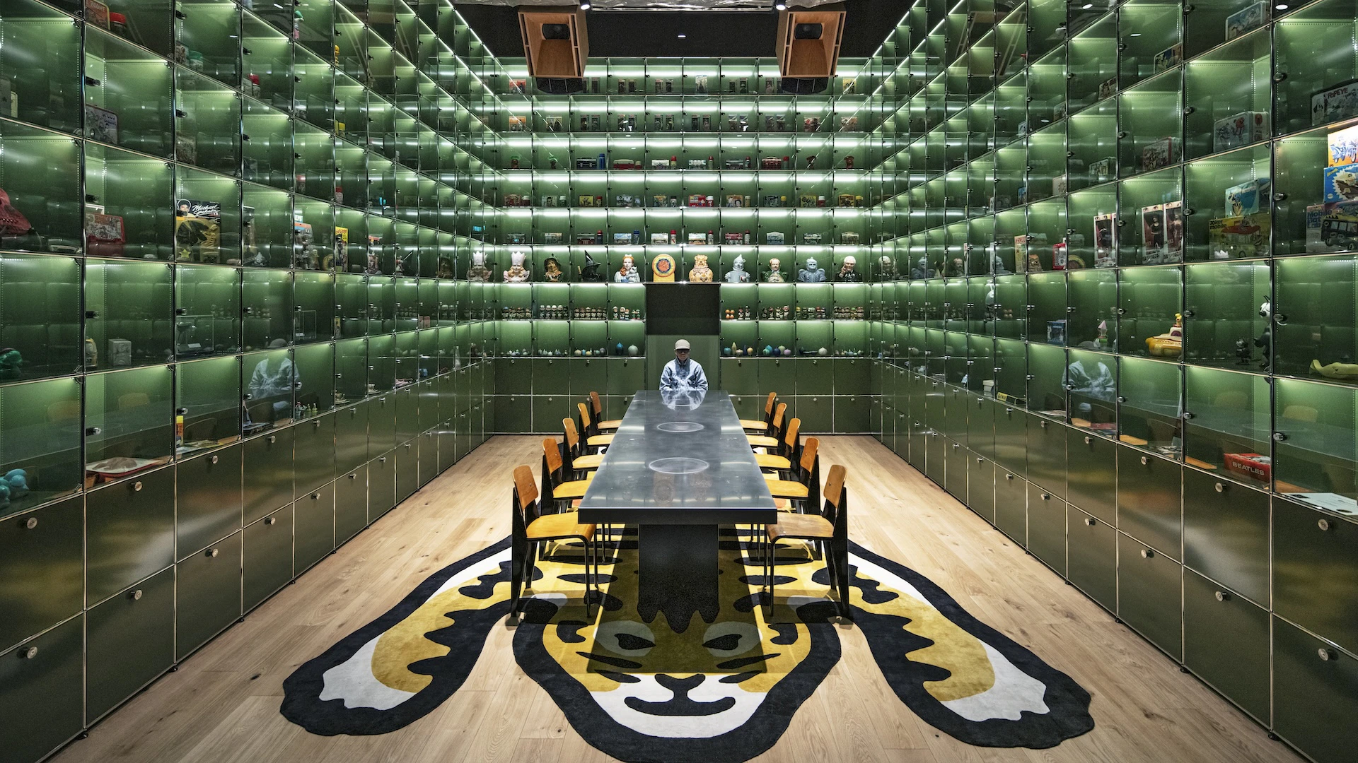 USMハラーの大型ユニットに囲まれたギャラリー&ダイニングエリアは、ロースター付きのテーブルを完備し、1日1組限定で会食や団らんのスペースとして利用可能。284個のユニットには、NIGO®氏がディスプレイしたコレクションが並びます。