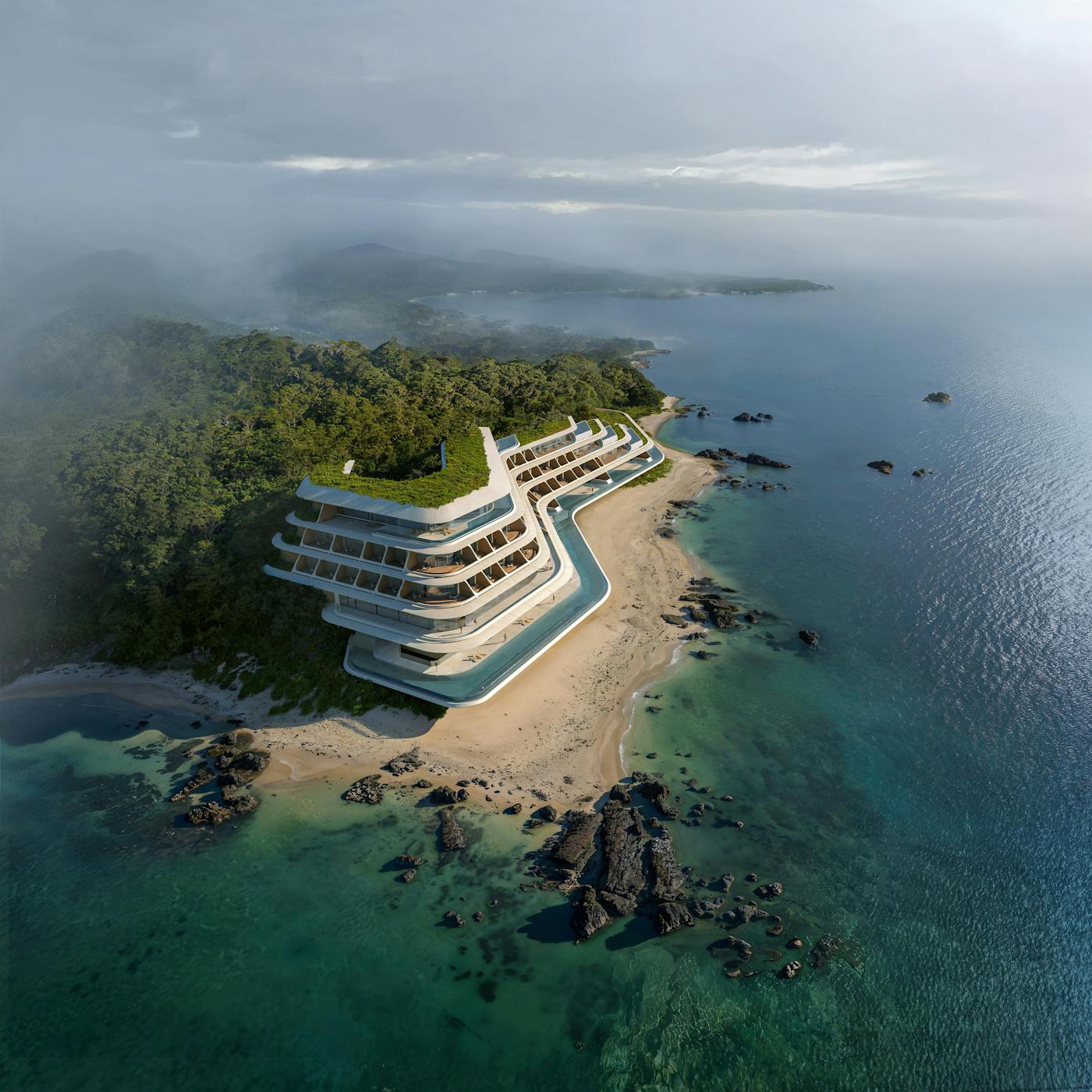 「敷地が持つ卓越した地形から着想を得た今回のデザインは、自然界に見られる地形形成の探求を通じて構成や素材にアプローチする、ZHAの継続的な研究の延長線上にあります。ホテルの段状キャノピーは、独特な海岸線の地質から熱帯雨林の豊かな植生へと柔らかくつながり、海の眺望を遮ることなく、周囲の環境との深い一体感をもたらします。同時に、プライバシーを確保することで利用者体験をより豊かにし、この地域に広がる多様な自然生態系を巡る“発見の旅”を描き出します。」——Ludovico Lombardi(Zaha Hadid Architects)