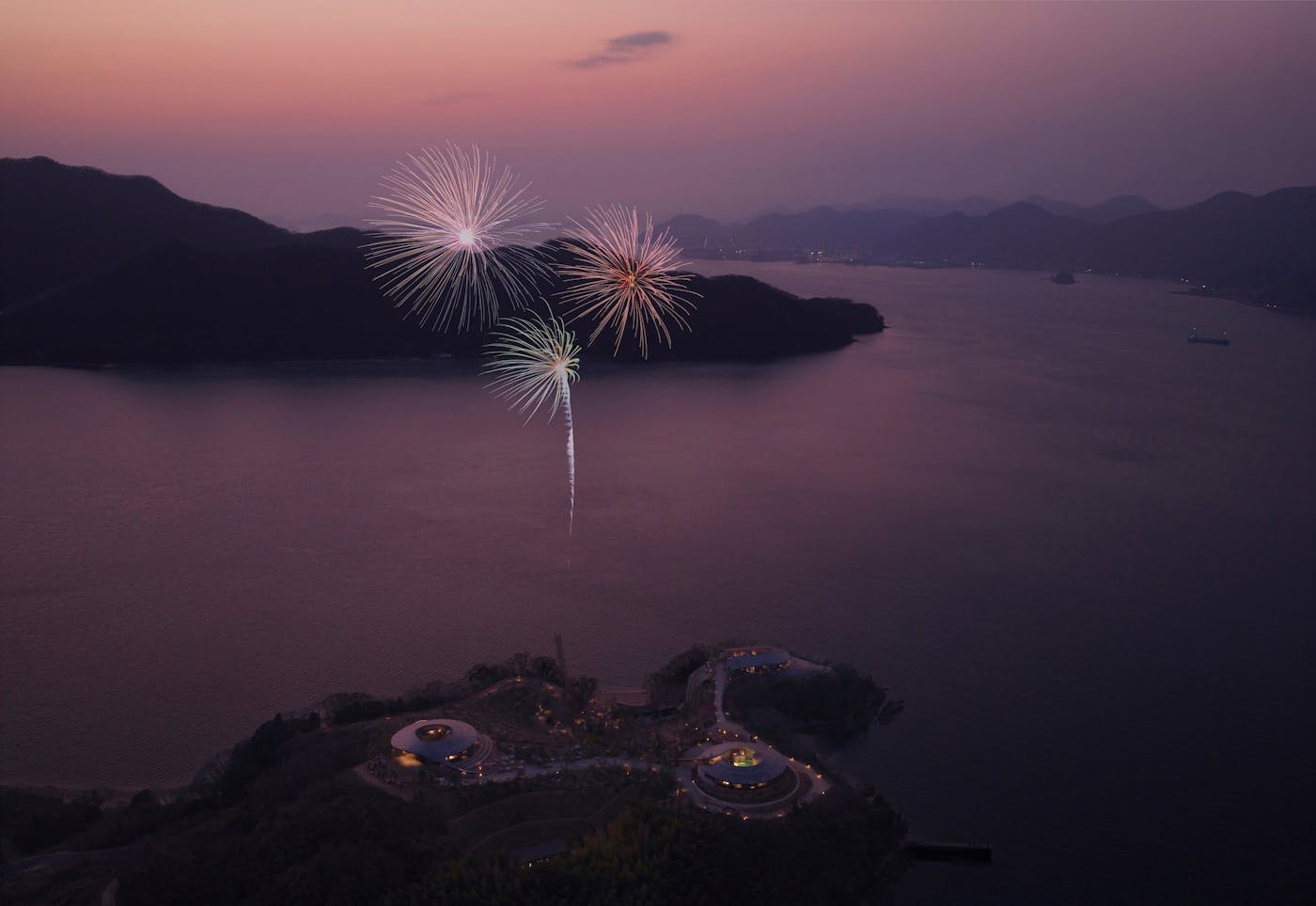 静寂に包まれた夜の瀬戸内海を背景に、仲間たちで楽しむプライベート花火。夜空に咲く花火が水面を染め、大切な人との特別な時間を演出します。