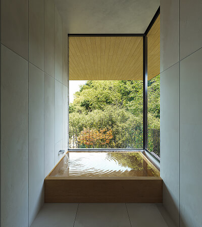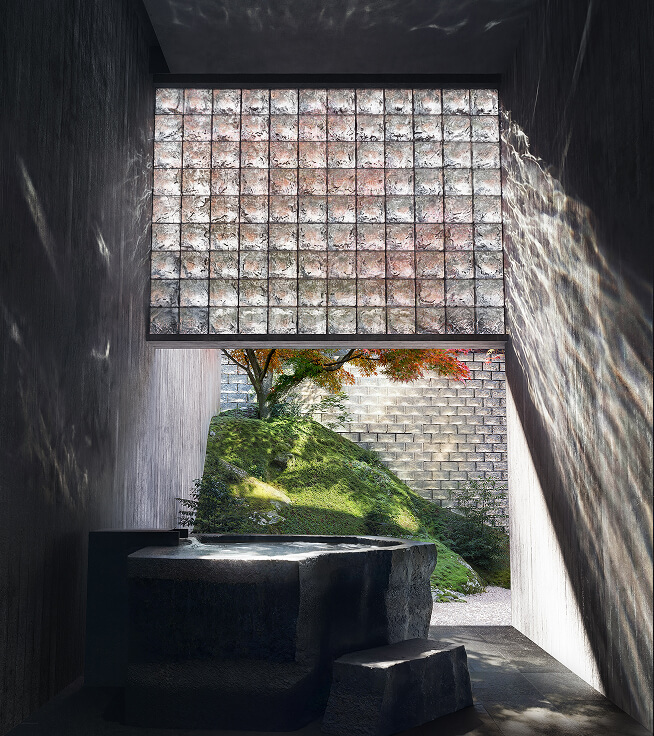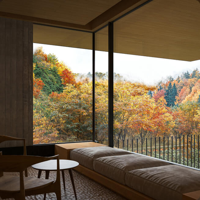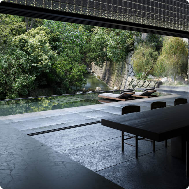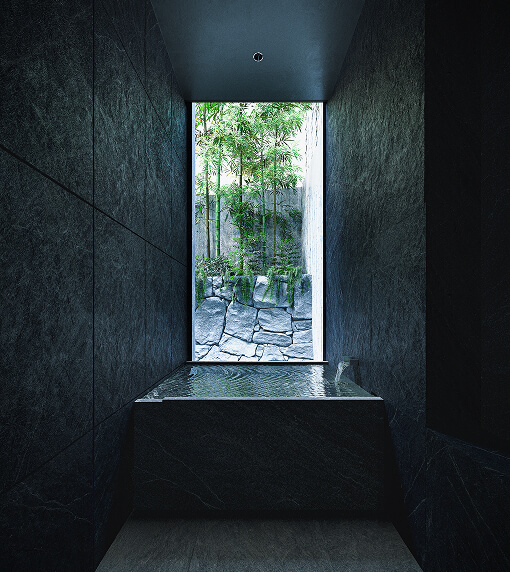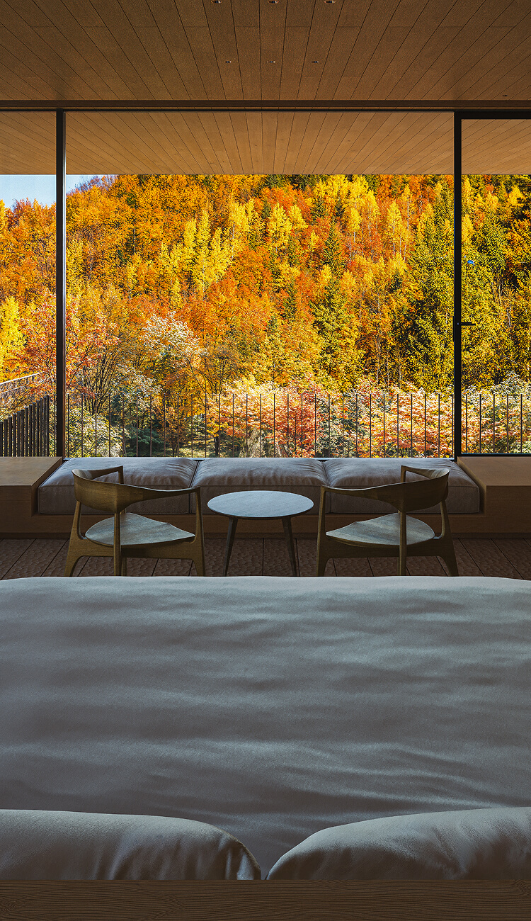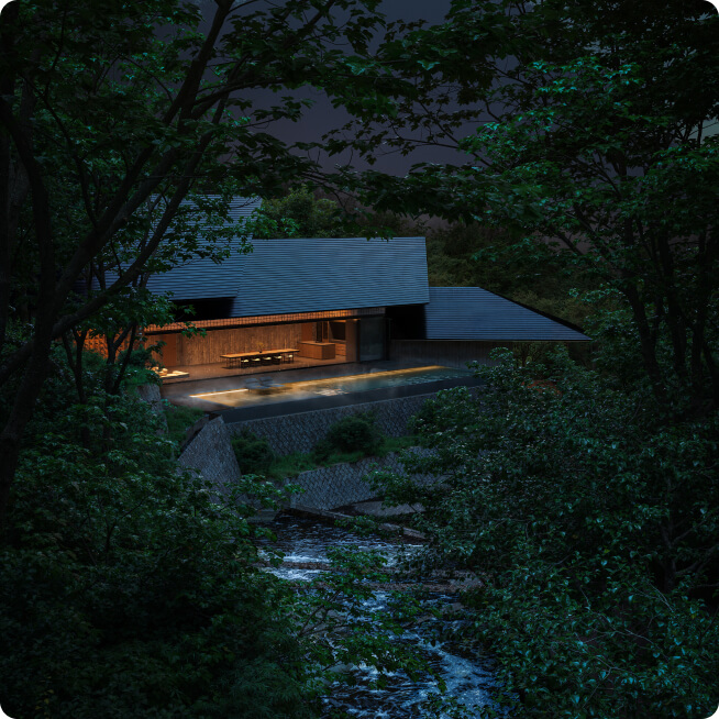 インフィニティプールと隣り合う、川を見渡す露天風呂。開放感と落ち着きを備えた、中庭に面する内風呂。風情ある庭の中に、ひっそりと佇む野天風呂。その日の気分や感覚のままに湯を巡り、心と身体を芯から癒す。サウナは、内風呂や露天風呂、プールと連続する動線上に計画。遮るもののない自然の中に身を置くことで、呼吸は深まり、感覚が研ぎ澄まされていく。