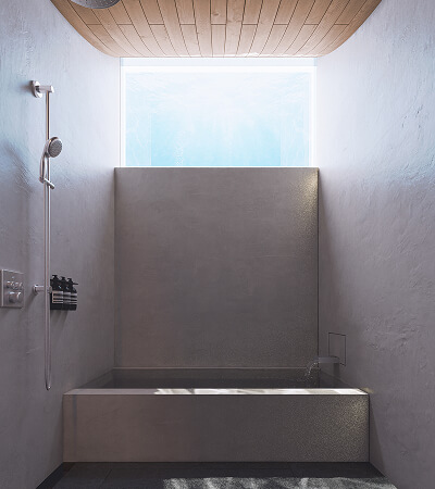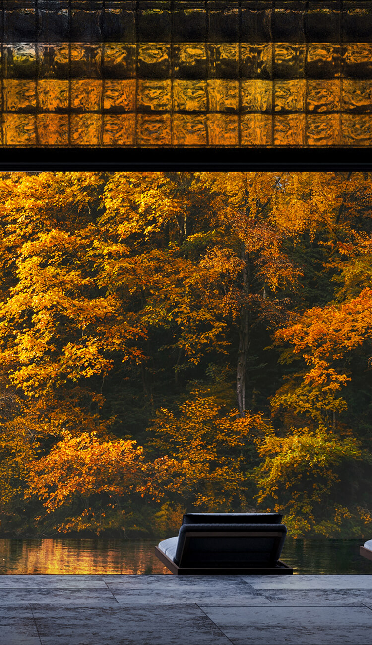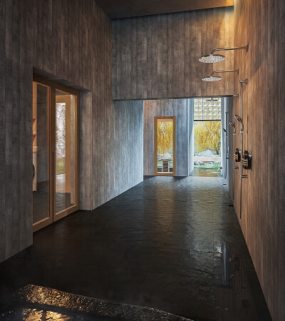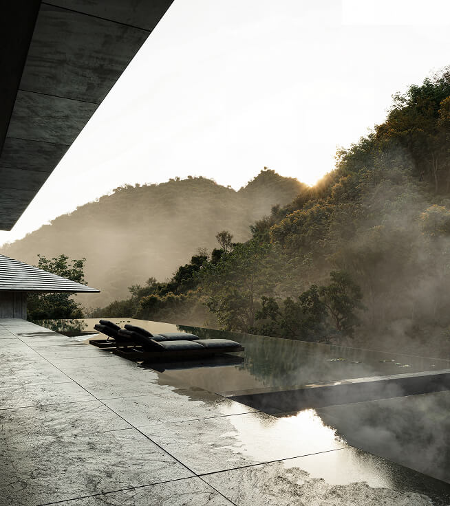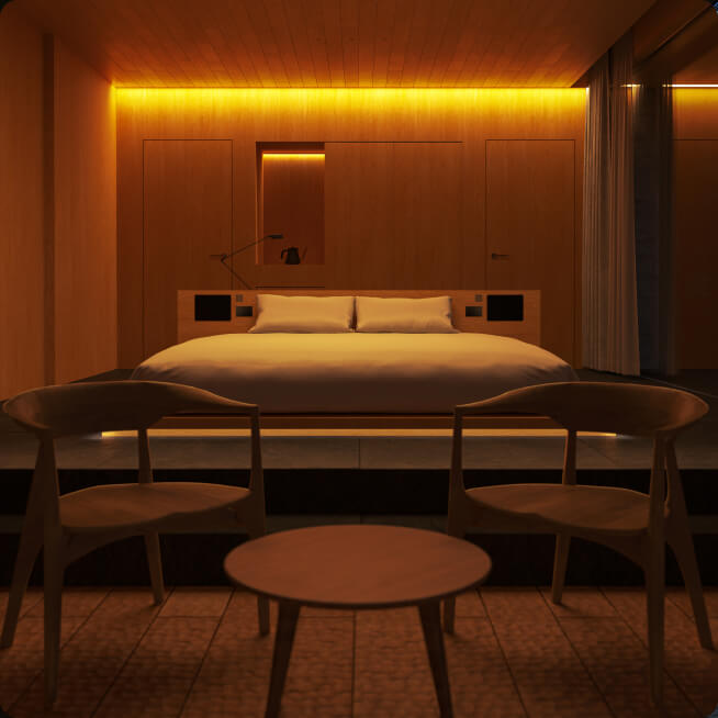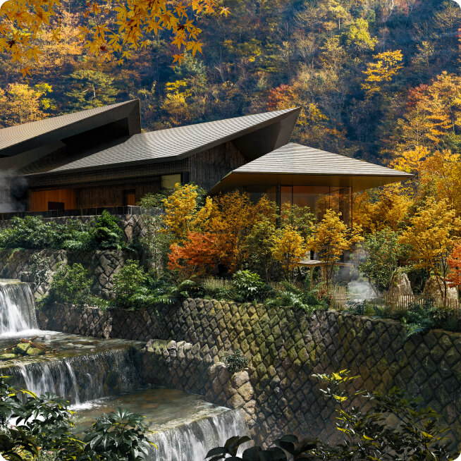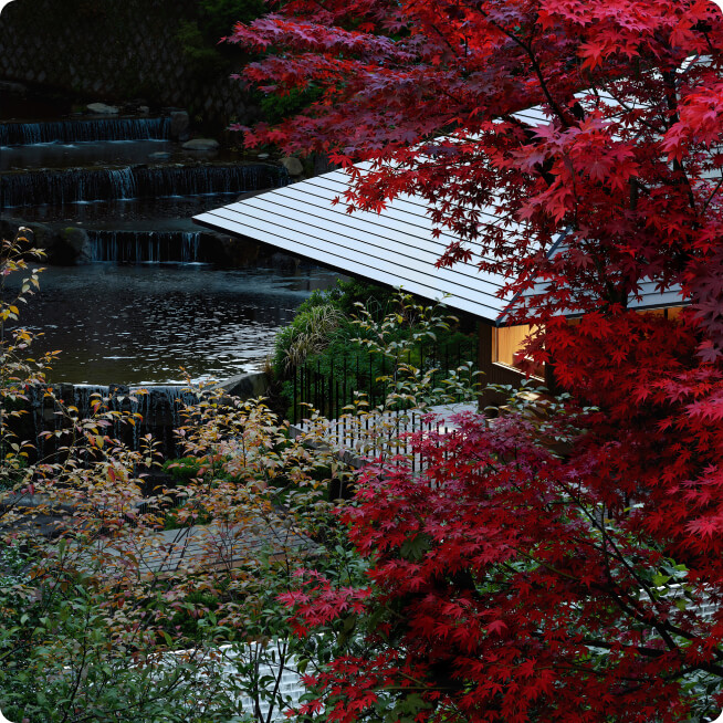 インフィニティプールと隣り合う、川を見渡す露天風呂。開放感と落ち着きを備えた、中庭に面する内風呂。風情ある庭の中に、ひっそりと佇む野天風呂。その日の気分や感覚のままに湯を巡り、心と身体を芯から癒す。サウナは、内風呂や露天風呂、プールと連続する動線上に計画。遮るもののない自然の中に身を置くことで、呼吸は深まり、感覚が研ぎ澄まされていく。