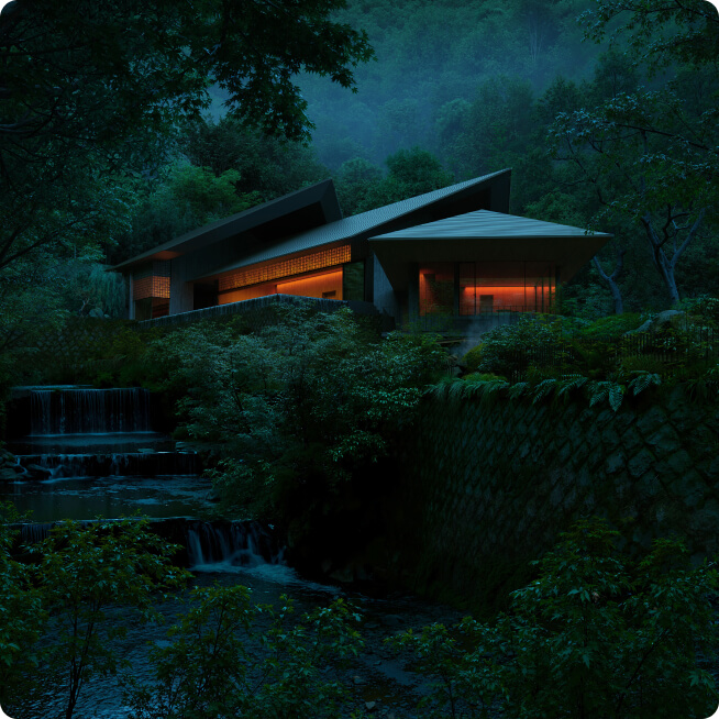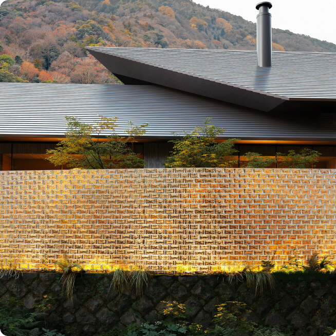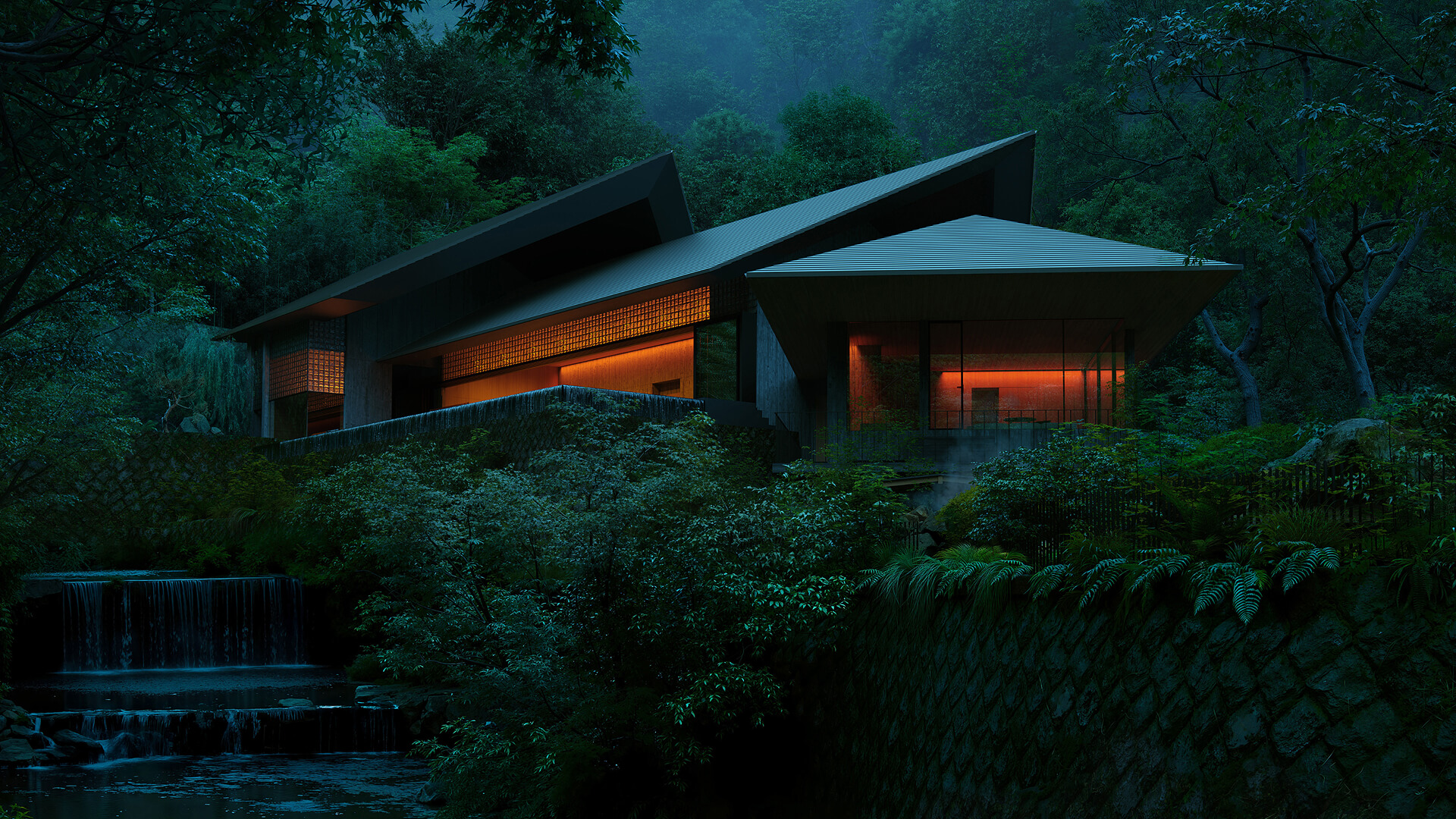 段差のある地形に寄り添うように、レベルの異なるフロアを連続的に配置。部屋を移動するたびに自然との距離感が緩やかに変化する構成によって、滞在は敷地と呼応するものに。3枚に折り重なる屋根がそれらを包み込み、ひとつの風景としてつなぐ。