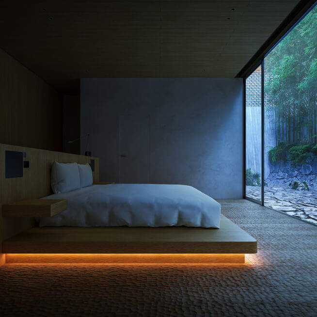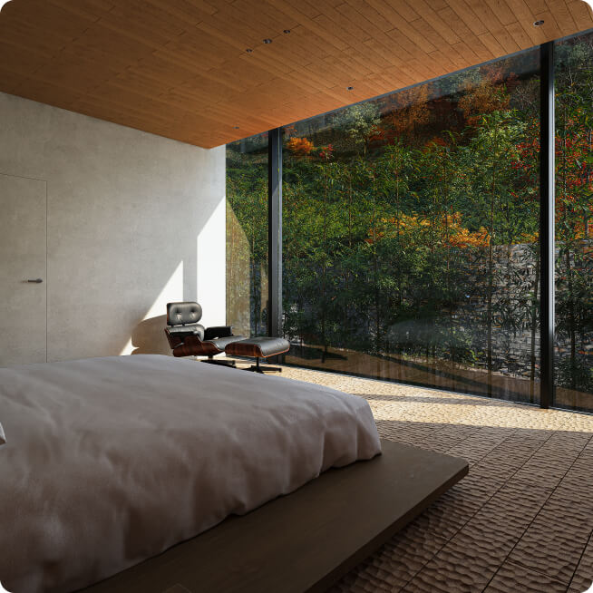 リビング&ダイニングから数段下った先、プライマリーベッドルームは庭に張り出す離れのような設計に。ガラス張りのコーナーから庭や自然の風景を望み、森に浮かぶ浮遊感と自然に溶け込む没入感が味わえる。各階に1室ずつ配置したゲストベッドルームは、閑寂な中庭の風景と向き合う、