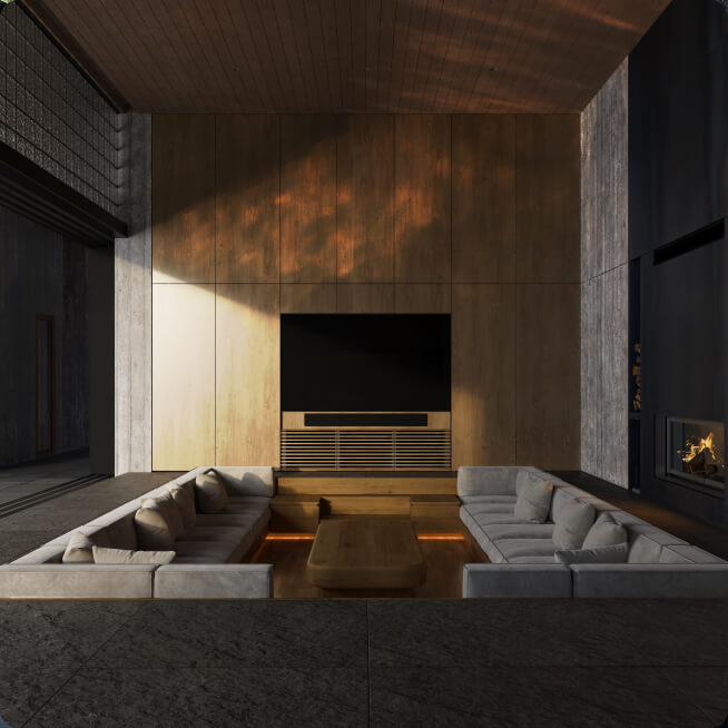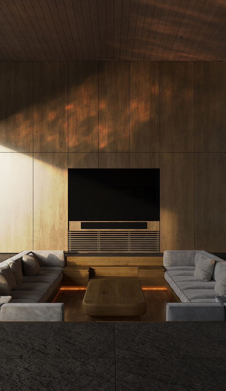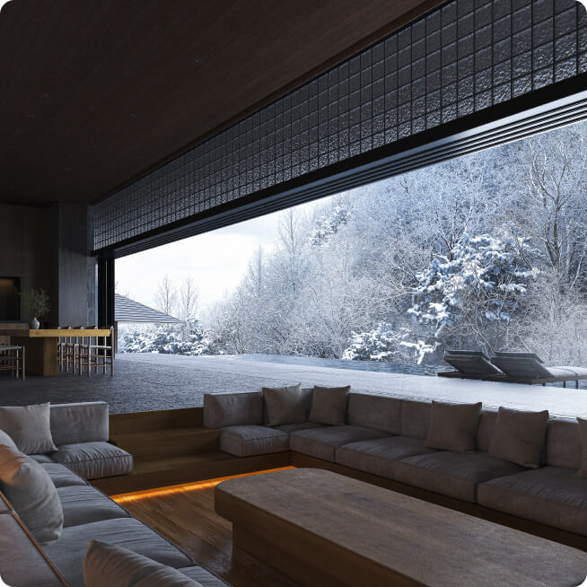 幅17mの大開口が絵巻物のような景色を切り取るリビング&ダイニング。ガラスブロックを通して差し込む光のゆらぎが水や湯の気配を思わせ、空間にやわらかなリズムをもたらす。