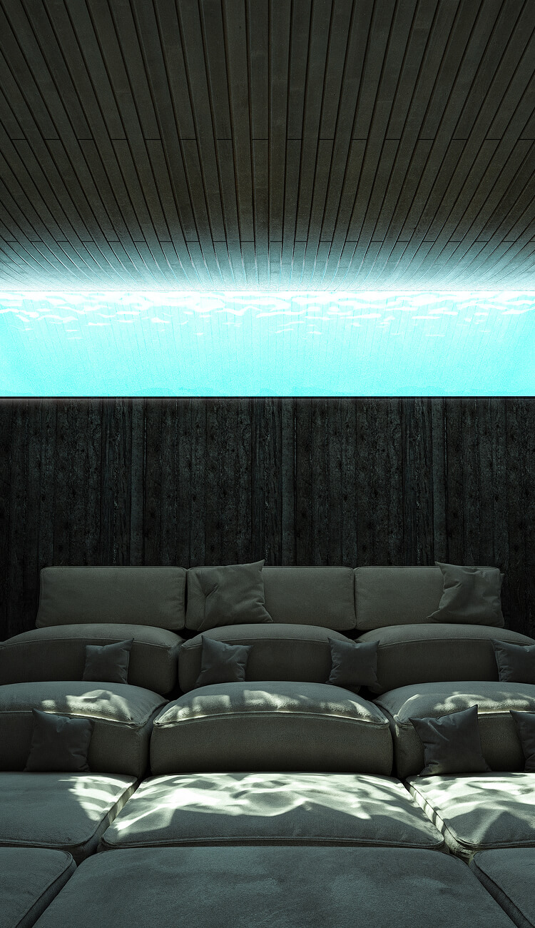 窓の外に揺れるプールの水が光を透過し、まるで川底に潜ったかのような淡い光が漂う。