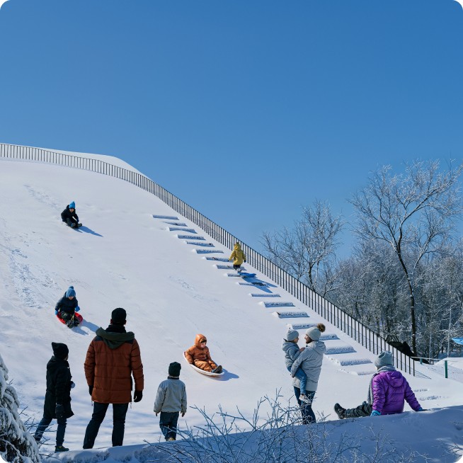 冬は雪に覆われた大屋根でそり遊びを楽しみ、温かな室内ではアスレチックで体を動かしたり、