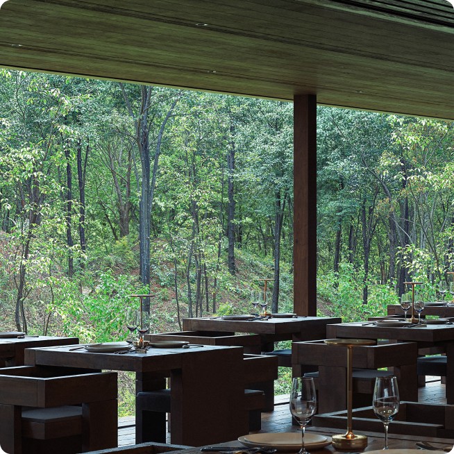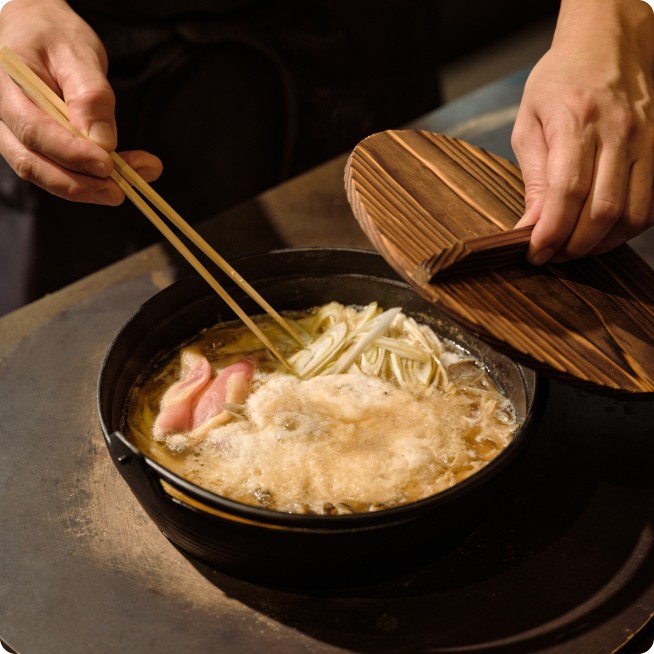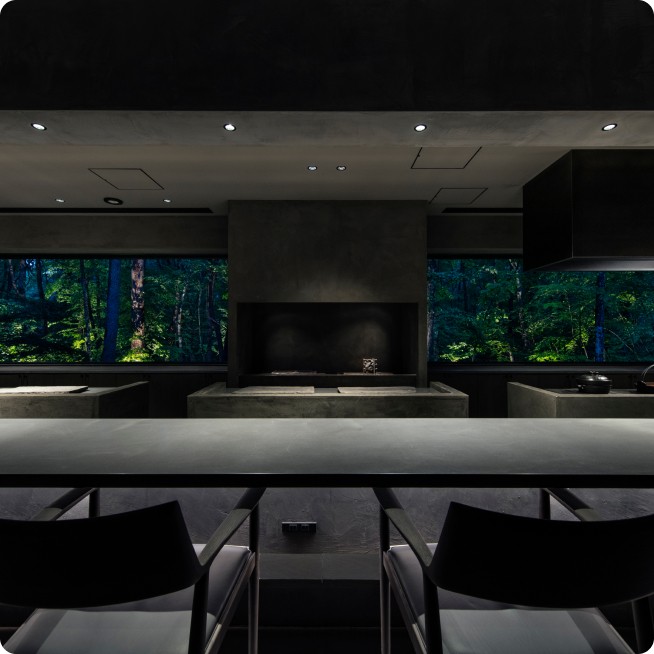 囲炉裏の炭の香りをまとった肉や魚介、野菜、心落ち着く鍋料理と竈で炊く時季の土鍋炊き込みご飯など、北軽井沢ならではの素材を活かした食体験を楽しめる。