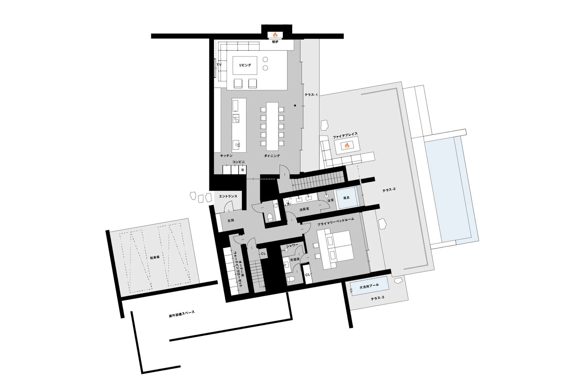 SUPPOSE DESIGN OFFICEが手掛ける3棟目は、景色に開かれた庭やドッグランを備え、愛するペットを同伴できる建築。洞窟のような水風呂や、自然に溶け合うリビングダイニングといったアイコニックな設備を備える。