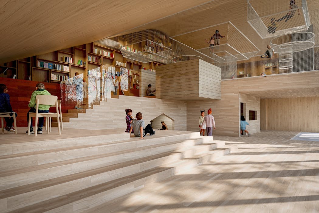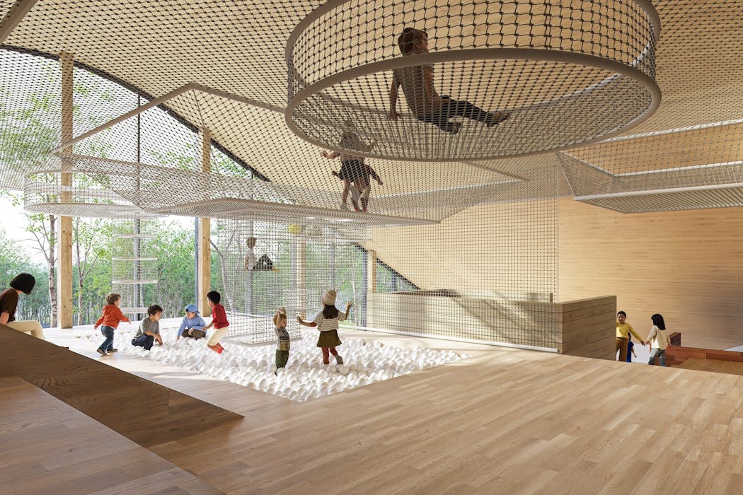 キッズパークの建物は、外の広場に向かって大きなガラス張りになっており、室内にいても外を感じ、自然環境との一体感を得られる。室内は、木の温かみに包まれる空間。頭上のネット遊具を移動したり、ボールプールで遊んだりできるアスレチックジムや、本が置かれたライブラリーなどが、多様な過ごし方を誘う。 「外遊びが好きな子もいれば、静かに本を読みたい子、寒い時や暑い時も体をめいっぱい動かしたい子もいる。こうした多様性を受け入れられる設計です。張り巡らせたネット遊具は、身体のバランスを取ったり、移動したりといった幼少期に体得すべき『36の基本動作』が自然と生まれるよう、取り入れています」(日比野氏)