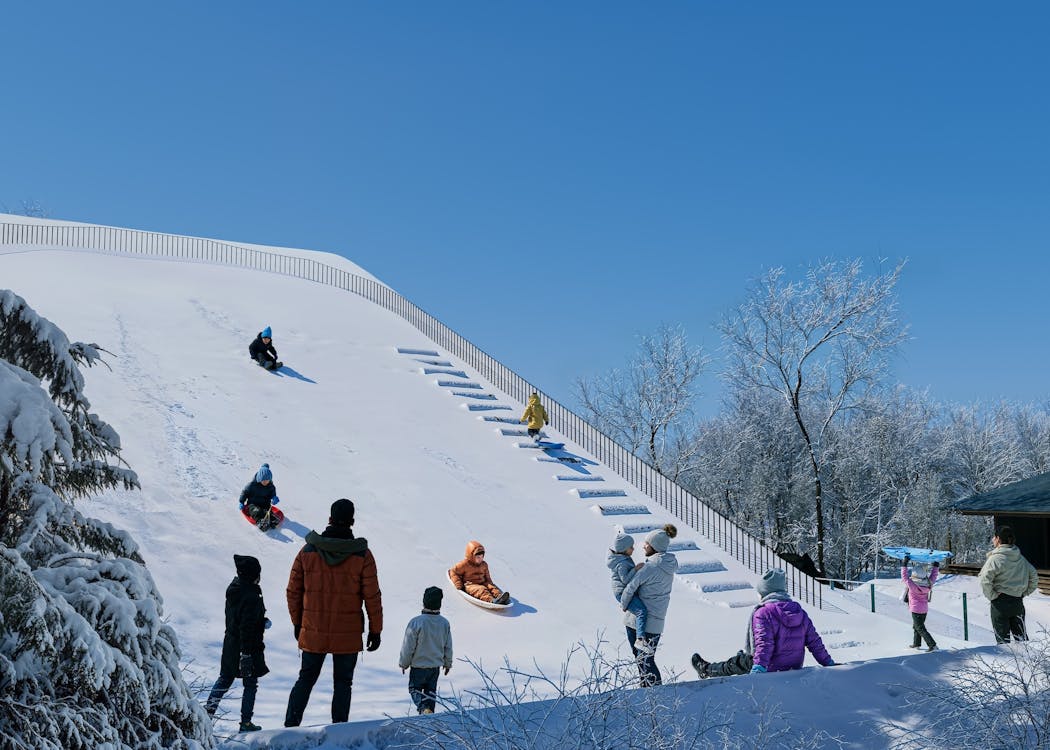 日比野設計が設計した新潟・十日町にある「認定こども園 愛宕幼稚園」。園舎と園庭をつなぐ巨大なスロープが特長のひとつであり、豪雪地帯という立地特性を活かして、雪の日でもそり遊びなど子どもたちの遊び場になるようにデザインされた。