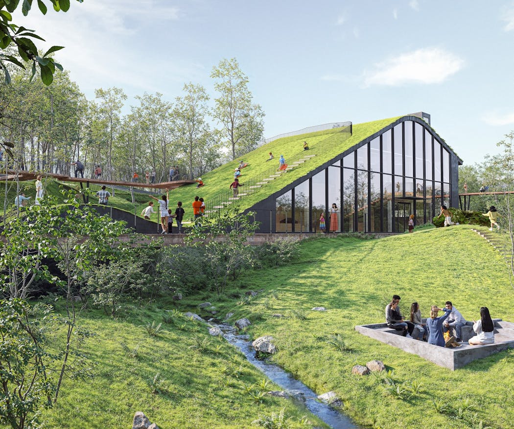 佐々木氏はNOT A HOTELからキッズパークの設計依頼を受け、北軽井沢の敷地を初めて見に行った際、その自然環境の豊かさに圧倒されたと振り返る。 「『NOT A HOTEL KITAKARUIZAWA』の敷地が、本当に素晴らしくて。自然の斜面があり、水が湧き、豊かな植生がある。生い茂る草の中を歩いたり、大きな岩や斜面を登ったりする体験は、子どもたちにとって楽しいに違いないと感じました。新しくつくるというより、すでにそこにあるものをそのまま感じられ、もっと楽しくするのが私たちの使命だと思いました」(佐々木氏) この雄大な自然の魅力を生かすための建築とは何か。NOT A HOTEL ARCHITECTSと共に考えながら、施設の規模や内容が決まっていった。 手がかりの一つとなったのが、日比野設計が2021年に設計した「認定こども園 愛宕幼稚園」だ。冬になると3〜4mの雪が積もる新潟県十日町市にある園舎には、建物と園庭をつなぐスロープをつくった。冬は雪そりを、それ以外の季節は草すべりを楽しめる遊び場となる。自然環境を建築に取り込み、季節ごとの楽しみ方ができるこのデザインが、今回のキッズパークの大きな草屋根につながっていった。