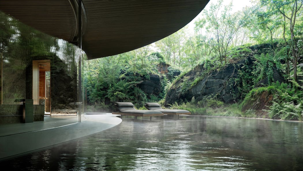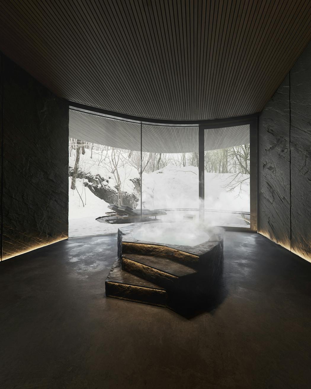 「宿泊施設としての快適性を確保するためには、大胆なデザインだけではなく、設備設計や細かな建材選び、高度な施工技術などさまざまな要素が必要になります。特に季節により気候が大きく変化する北軽井沢という土地にあって、快適な室内環境を生み出すためのノウハウは、NOT A HOTELチームのバックアップがなくして形にすることは難しかったでしょう。当初のプランにはなかったのですが、設計を詰めていく段階で露天風呂を追加してほしいというリクエストももらいました。試行錯誤の末、バスエリアを延長するように、巨大な岩に囲まれた洞窟のような場所に温泉を湛える露天風呂をデザインしています。これもまた地形に溶け込んだものとなっていて、ここでの体験に深みを与えてくれたように思っています」(Nahed氏)